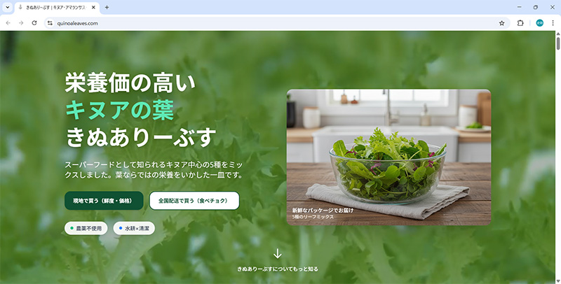 2025/12/10 TOPICS 『きぬありーぶす』特設サイトオープン スーパーフードとして知られるキヌアを中心とした5種の野菜をミックスした「きぬありーぶす」を紹介する特設サイトをオープンしました。 ぜひ以下のURLよりご覧ください。 https://quinoaleaves.com/